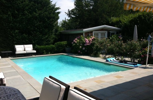 Enter home through bronze screened porch into foyer/sitting room, dining area adjacent to large open gourmet kitchen with fireplace. Bedroom/office with a day bed (Single bed), full bath and laundry area complete the first level. Upstairs features a beautiful master suite (Queen bed), large master bath with vaulted ceiling. Additional bedroom (Double bed) and bathroom bring together the 2nd level. The house provides comfortable accommodation for at least 4 guest, depending on the configuration of the party maximum up to 5 people. Outdoor very private, spaces include a heated in-ground gunite pool with bluestone surround patio, small cabana and outdoor shower. Fabulous landscaping, lighting, IGS, outdoor sound system and classic contemporary patio furniture complete the divine sophistication that is this home.