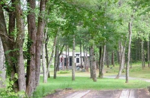 The cabins at Hidden Hollow are nestled in an enchanting grove of Sweet Birch trees and lush ferns. A babbling brook (the East Fork of the French Broad River) meanders through the property. You'll find yourselves completely relaxed and immersed in nature as soon as you cross over the wooden bridge. You can fly-fish steps from your cabin or take a short drive to one of several spots on East Fork Rd/Walnut Holler. There are two cabins that can be rented together.