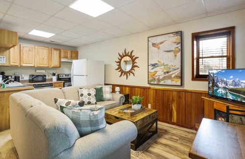 The cabin offers four distinct sleeping areas, including a queen bedroom and a bunk room with two twin-over-twin bunk beds on the main level. The upper-level open loft features a king bed and an attached bathroom. The charm extends to the lower level, which functions as a separate living space with a full living room, kitchen, bathroom, and an additional queen bedroom. Each bedroom is equipped with a TV, ensuring comfort and entertainment for all.
