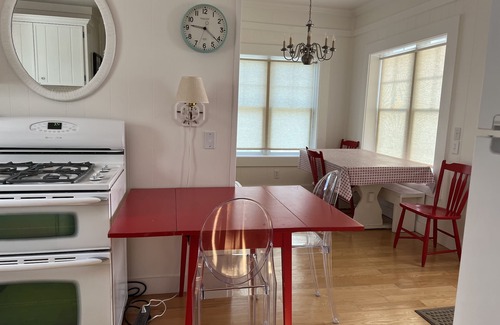 206 Clinton Cottage is a charming updated ranch-style home with central air conditioning and hardwood floors throughout. ALL ROOMS ARE ON ONE FLOOR. The 'blue' master bedroom, has a queen bed and an ensuite bathroom with hand-held shower. A second bedroom, the 'green' room, has a full bed and a twin bed and attached full bath. The 'yellow' bedroom has two twin beds. Linens are provided. The kitchen is fully equipped and there is a very private deck off the kitchen/breakfast room with tables and seating. The patio has a gas grill. 206 has central air conditioning, both main floor and basement laundry centers with updated equipment. You will go home with clean clothes. There is a large paved driveway next to the house that will accommodate several cars. The front porch is lovely and a cozy spot for people watching and enjoying morning coffee and afternoon beverages.