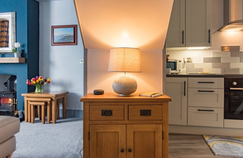 Corner sofa, wood burner, Smart TV, bluetooth speaker