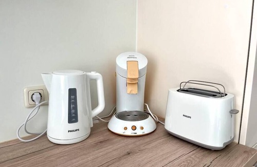 The kitchen is equipped with an oven, electric stove, refrigerator and freezer as well as a coffee pad machine, kettle and toaster. A small supply of coffee and tea is available.