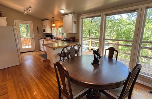 Escape to this serene 2-bedroom home on the Illinois River, just 5 minutes from Tahlequah. Enjoy breathtaking river views from the wrap-around deck, cozy up by the fireplace, or relax in the fully furnished space with high-speed WiFi. Features include a fully equipped kitchen, washer/dryer, grill, and easy river access. Pet-friendly (with approval). SUV/truck recommended. Book your stay today!