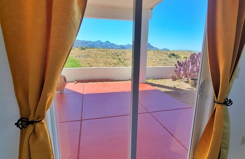 Hummingbird is a single story custom built 3 bedroom, 2 bath home with a split floor plan which sleeps up to 8 people. Fantastic views from every room in the house. An archway with a wooden turquoise door greets you and as you enter the home, you will find the kitchen, dining area and the main living room with fireplace, flat screen TV, Amazon Alexa and WiFi. In addition, as you stand in the kitchen or in the living room you can appreciate the amazing views of the surrounding area. The master bedroom with its King size bed has its own private entry/exit into the covered patio from where you can take in all the amazing views and sunsets. The master bathroom has two sinks and a jetted tub with an oversized window which allows you to appreciate the outdoors from the comfort of you bath. The guest bedroom has a queen size bed and from here you can appreciate beautiful sunrise views. The second guest bedroom with two twin bunk beds can sleep 4 (2 adults and 2 kids/teenagers or 4 kids/teenagers), the second guest room also allows for amazing sunrise views. Washer/drier in the premises and plenty of parking space at the property. Stepping outside you get 360 degrees of views that you can enjoy while relaxing in a hammock as you admire the stunning sunsets (and/or sunrises). Enjoy a quiet cup of coffee or tea with the birds during the day; and at night enjoy a glass of wine by the southwestern chimenea to warm up to the cool Arizona fall and winter nights while you look for shooting stars.