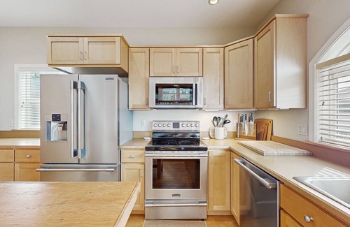Step inside to an inviting, open-concept living space where you can unwind after a day of exploring. The well-equipped kitchen makes meal prep a breeze, while the cozy living room provides the perfect spot to relax. For fitness enthusiasts, a Peloton bike is available, so you can keep up with your workouts while enjoying the coast. Traveling with little ones? A Pack ‘n Play is provided for your convenience. Plus, a collection of board games ensures fun-filled evenings for the whole family.