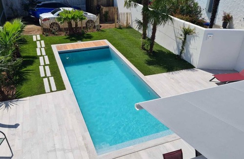 It has 4 large bedrooms with 160x200 beds, including 1 on the ground floor. The surface area of 140m² is ideal for 8/10 people (with the possibility of accommodating 4 additional people in a 2-room annex). The main room of 50m² is made up of a living room, a lounge with 200 cm television and an American kitchen. Its pocket bay window opens onto the garden and swimming pool.