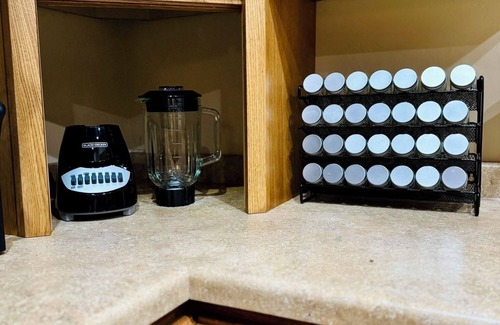 Inside, the warm pine-wood interior creates a cozy, inviting atmosphere. The open-concept living area blends modern décor with rustic charm, while the fully equipped kitchen provides everything you need, including a blender, air fryer, toaster oven, and coffee machine.
