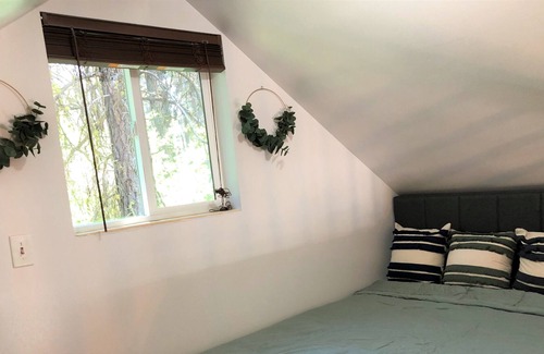 Come enjoy this charming cabin on .64 acre lot w/ 520 sq ft of living space. Bedroom loft w/ comfy full size memory foam bed. Living room sofa w/ queen size pull out bed. Kitchen has island bar w/ seating, apt size oven/stove, mini fridge/freezer (4.5 cu ft), & is equipped with all the basics. Seasonal outdoor eating space & large deck. 55" smart TV in living area with access to popular streaming services. Easy access to nearby golf course, geothermal pool, & restaurant/lounge. 10 min to Crouch.