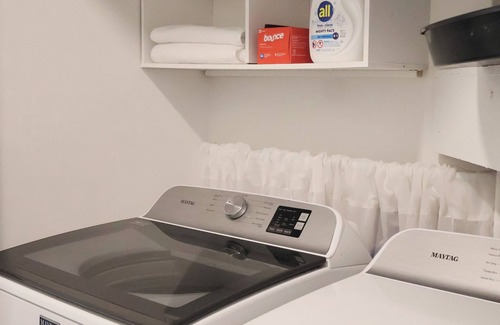 Newer washer dryer on site. Storage above and high end laundry detergent and dryer sheets are included for your convenience. Every room has a white laundry basket that fits on top of the washer dryer. So you can do your laundry and close the doors, making it easy to clean.