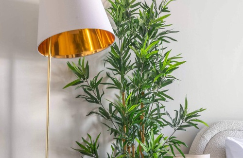 Next to it is an inviting queen-sized bed fitted with a luxurious mattress, premium linen, and soft pillows for your overall comfort. The bed space comes complete with a bedside table and lamp, an upholstered headboard, and other decorative items that give you luxury feelings.