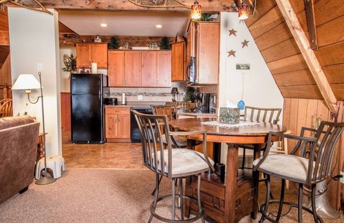 Vista View is a lovely A-frame style vacation home perfect for several families or one large family. It offers 1 bedroom and 1 bathroom on the upper level and 2 bedrooms, 1 bathroom, kitchen, living room and dining room on the main level. The kitchen and dining area are open and lead into the living room, which offers high ceilings, large windows overlooking the ski hill and a fantastic free-standing fireplace. This home also offers a washer and dryer, a charcoal grill on the back deck and WIFI