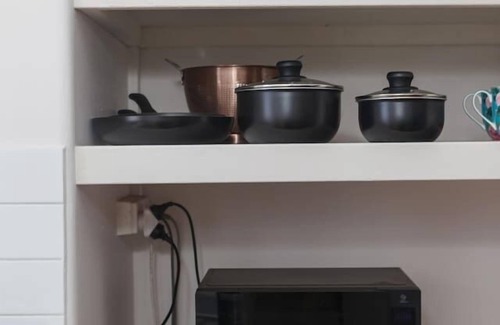 Kick back on the leather lounge amongst the sun-filled windows and breeze from the adjoining balcony. Dining at home is easy with a large wooden table that comfortably seats four guests. On a mild day enjoy your meal on the balcony which is pleasantly shaded under cover. The kitchen area has ample bench space, cabinet storage and cooking basics to get you started on your creations. Bask in the sunlight filling the kitchen from an additional charming balcony. A washing machine is conveniently stored to ensure you can easily settle in for longer stays.