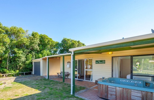 No matter the time of year, Chateau de Lovelace is sure to please with large sliding doors to let the summer breeze in, or a wood-burning fireplace to keep the home toasty warm. And the living area opens out onto a sheltered patio, where you'll find a spa pool, an inviting treat at the end of the day.