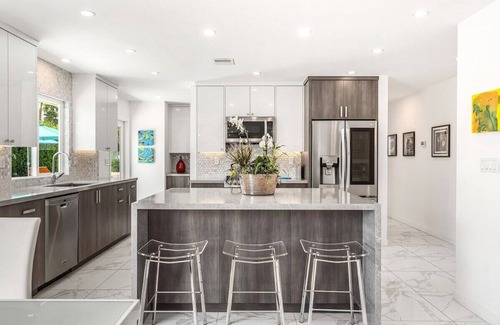 From the moment you step through the bright yellow front door, you'll be captivated by the open-concept design, gleaming marble floors, and carefully curated artwork that set the tone for an unforgettable stay.