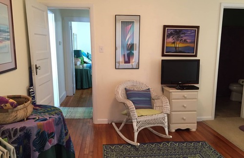 From the front porch of the Sunrise Cottage enjoy a 180 degree view of the Potomac River while rocking your cares away! Watch the sun rise between your toes from the larger bedroom's french doors. Sit inside in a sun-filled front room with large windows in gliding chairs or in the afternoon or evening on a comfy sofa and basket chairs in the back family room. With a good-sized kitchen and two bedrooms, this cottage is a perfect place to stay for two couples. You'll love it's cheery beachy decor and some original features (hardwood floor, paneled doors, metal kitchen cabinets).