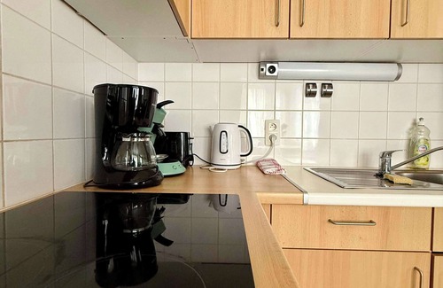 Modern fully equipped kitchen: microwave, stovetop, dishes, Senseo coffee machine