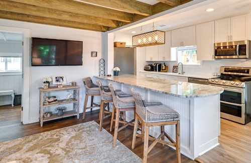 Nestled amongst the oaks, this vacation rental was recently renovated with a bright and modern interior. Great for families and boasting 2 bedrooms, a sleeping loft, and 2 bathrooms, this retreat provides a well-equipped kitchen with high-end amenities, 2 Smart TVs, and an outdoor shower. The historic home in the heart of Myrtle Beach proper is mere steps from the beach. After visiting the Boardwalk and Promenade, return to this dreamy home to relax before another perfect South Carolina day.