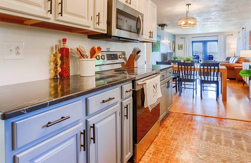 The open floor plan of this cozy home makes lounging a breeze! The wide galley kitchen offers plenty of counter space and everything you need and more to prepare your favorite meals. A wooden dining table separates the kitchen area from the living area adorned with comfortable furniture.