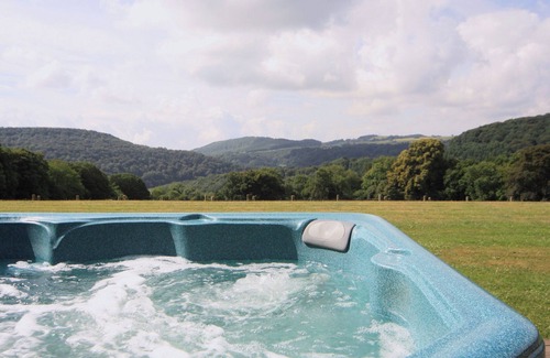 Warm and welcoming lodge, with wonderful views over Wye Valley, and with own hot tub to relax in.. 1 step to entrance.