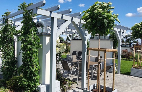 A high-class, new modern classical apartment in a historic tenement house from 1936. Located on the 2nd floor in a new outbuilding of a historic tenement house complex. With access to the beautiful garden on thevroof of the building with table and sun loungers - entrance on the 5th floor.