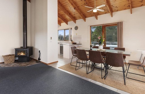 A wonderful private house in a convenient location, this is the ideal place to stay to explore the magnificient surf coast. Cabin-esque wood panelling and sloped beams bring the outside in, capturing the calming essence of your leafy surrounds. Scandi-inspired interiors update this comfortable home, adding a stylish edge to your entertaining space.