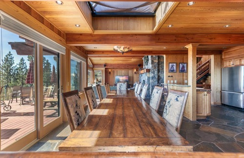 As you step through the entrance of this luxury vacation home, 5.5-bathroom Lake Tahoe sanctuary, spanning approximately 5,000 square feet, you'll appreciate the immaculate wood finishes and sweeping views of Lake Tahoe from almost every room in the house. The impressive great room, with its wood-planked ceilings and floor-to-ceiling windows, offers a fantastic setting for unforgettable gatherings with loved ones. The living room features a majestic wood-burning fireplace, plush furnishings, and a flat-screen TV. It seamlessly transitions into the spacious dining area, which has a generous-sized dining table that accommodates 12 guests. Whether you choose to appreciate Lake Tahoe's beauty from indoors or step out onto the expansive deck just off the great room, you'll be treated to truly spectacular views. You'll love preparing meals in the gorgeous chef's kitchen, which boasts granite countertops, two concrete sinks, top-of-the-line stainless steel appliances (including a double oven with a 6-burner gas stove and built-in griddle), and two breakfast bars with seating for five.