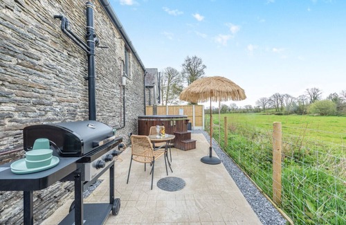 Outside, a private enclosed patio overlooks a sprawling field where Welsh cob horses may roam, offering a tranquil vista. A wood-fired hot tub awaits, complete with soothing lights and bubbles.