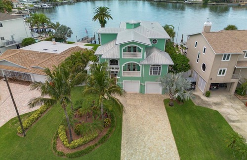Discover a towering 3-story home with stunning views from every balcony, including a Lanai on the 3rd level. Elevator access ensures convenience and assistance with luggage. The spacious driveway accommodates 8 vehicles, with a grand staircase entrance welcoming you. The low-profile Golf Cart is included in the nightly rate (Liability release required). Conveniently located minutes away from Restaurants, Beach, and Water Rentals, with a central position between St. Pete, Clearwater, and Tampa.