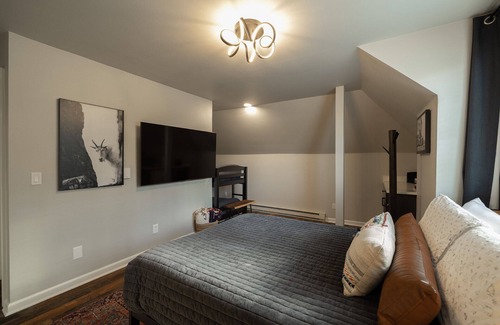This room may be one of the greatest hotel rooms because of the very special llama loft. Extra space to unwind can be found upstairs in the private loft. Sleep downstairs with the cozy, yet luxurious queen bed and bring the kids who will love the twin bunk beds. Room features a mini-fridge x 2, coffee station, walk-in shower, debatably large TV for size of space and thoughtful touches throughout.