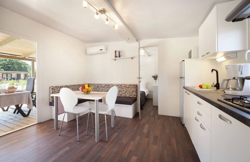 The 6-person chalets are spread over Resort Polari, each on their own grounds. There's the standard chalet (HR-52210-42), located in a green part of the park, between the trees. With this type you'll be using the common swimming pool. In this type pets are also allowed. There's also the premium chalet (HR-52210-43). The chalets of this type are mostly in a newer part of the resort. With this type you'll be sharing a swimming pool with fifteen other chalets from the immediate vicinity of your chalet. Both types are completely and comfortably furnished. There are two bedrooms (one open kitchen and a with bathroom with shower and toilet), a second bathroom with shower and toilet, a living room with double sofa bed, an open kitchen and air conditioning. Outside you'll have a covered terrace with garden furniture and four loungers at your disposal. The chalets are suitable for 4 people. Parking is possible in the central car parks, always close to your chalet. Bedding is changed once a week. Towels twice a week.
