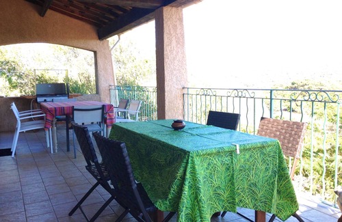 The entrance leads on the left a large traditional kitchen and a living room, a TV area and a dining room. The whole, air-conditioned, gives on a big terrace equipped with 2 tables and a barbecue with gas. The view is very nice and overlooks the valley.