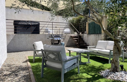 Spa Jacuzzi 50 jets 6 people on terrace of 25 m² with shade sail, chairs in a garden and resting.