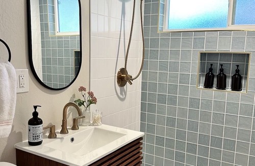 The home has a full bathroom, and is supplied with bath essentials (shampoo, body wash), towels, toilet paper, and a hairdryer.