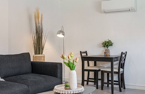 This is a spacious studio apartment with a dedicated living area complete with a double sofa bed and flat-screen TV. The air-conditioned space includes a king-size bed and well-equipped kitchen with convenient appliances. It also has two-person dining and an elegant bathroom. There’s an external communal laundry.