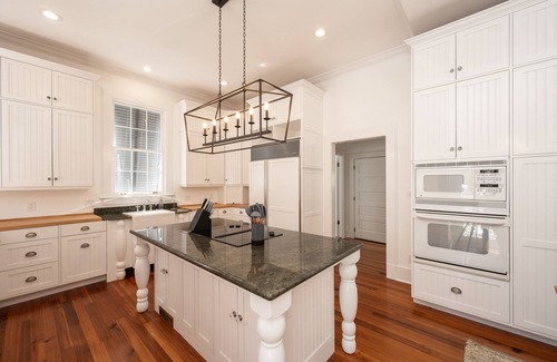 The primary suite features two beautiful bathrooms, one with a shower and the other with a soaking tub, built in closets, a lovely little reading nook and access to the inviting wrap around covered decks. There are two more bedrooms featuring twin beds that can be converted into a king. Both of these bedrooms have access to the wrap around decks complete with a sunning area, white rocking chairs and a quiet covered lounge.
