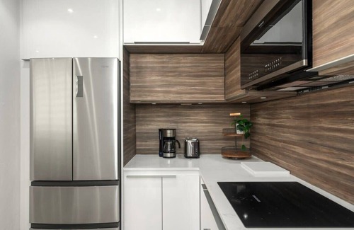 Condado Beach Oasis has a top-notch kitchen! The minimalist L-shaped kitchen features PVC white cabinets, quartz countertops, wood-like vinyl panels, and stainless steel appliances. The kitchen is stocked for all your cooking needs, it has a state-of-the-art full fridge, conventional microwave oven, toaster, and coffee maker.