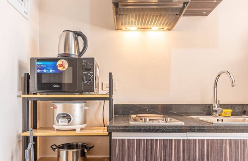 • The kitchenette comes complete with a microwave, stove, kettle, cookware, utensils, dishes, and a fridge—everything you need to cook and enjoy meals in your own space.