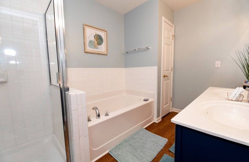 The Master suite occupies an entire floor of its own and features a massive bedroom equipped with a king-size bed, a dedicated workspace suited for remote work, a 55" 4K Smart TV, a walk-in closet, and a full bathroom with standup shower, full-size tub, and dual vanities!