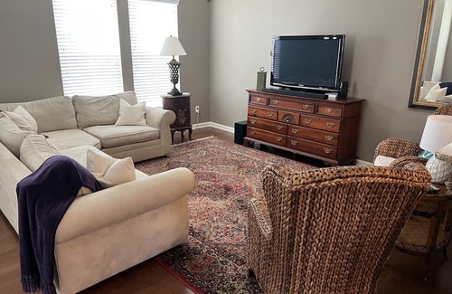 Enjoy our clean, comfortable, convenient second home just outside the beltline in Raleigh! Convenient to Coastal Credit Music Park, downtown, the Farmers' Market, Fairgrounds, RDU, walking trails and NCSU. Includes 2 bedrooms with queen beds, 1 full and 1 half bath, fully equipped kitchen, washer/dryer and outdoor patio with seating. For your entertainment, there's wireless internet, a bureau filled with board and card games and a large screen TV including bluetooth-enabled sound bar to enjoy music.