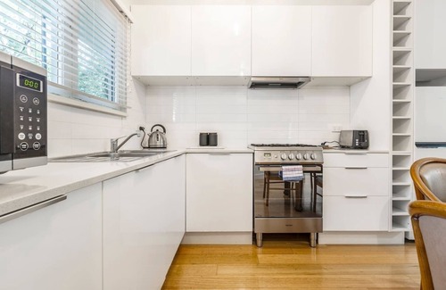 Stepping inside, a modern white kitchen allows you to prepare meals at home. It comes well-equipped for your holiday catering, and you’ll find Toorak Village with its supermarkets, shops and eateries just down the street. Sit down for a meal at the dining table or use this space for setting up a laptop if you’re on a working holiday. There’s a large L-shaped sofa to relax after a busy day along with a TV catering to your evening entertainment.