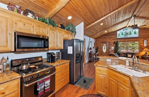 Copper Moose Creek immediately welcomes you into the main open living space where the pine wood accents, vaulted ceilings and high end mountain decor set the tone for a wonderful vacation. Cozy up in front of the wood-burning fireplace or catch your favorite show on the flat-screen Smart TV with streaming services. Enjoy the convenience of being able to gather together for quality time with your group where the living room, dining area, and kitchen seamlessly blend together.