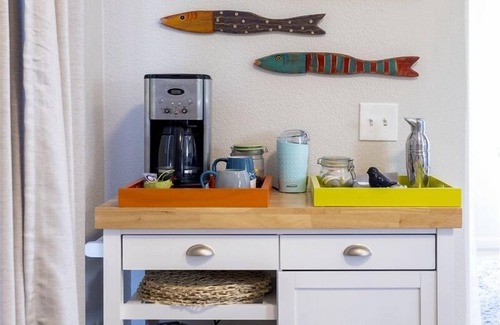 The Coração do Mar will always welcome you back at the end of a long day, but with so many amenities, you may just find yourself preferring to kick back in this little bubble of perfection. The living room features a soft and comfortable armchair and sectional couch facing a fireplace and big-screen TV (with Blu-Ray and Roku), the dining room has bench seats and a table big enough for fun family-style meals, and the patio and yard are perfect for afternoons or evenings al fresco. Look for hidden treasures throughout this Azores-inspired home, such as the driftwood sculptures and ocean-inspired paintings from local artists.