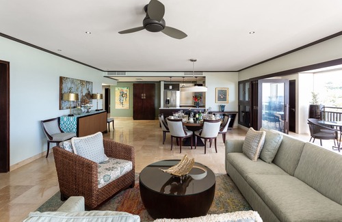 Crowsnest is a luxurious three-bedroom apartment encompassing 3,371 sq ft of beachfront living space. Its furnishings beautifully juxtapose the building's contemporary design with the island's tropical vibe. Light limestone tile flooring, granite countertops and stainless steel appliances compliment the selection of imported bamboo, rattan and dark wood furniture. The carpeting has been custom-designed to further enhance the apartment's design scheme. Each of the three bedrooms is en suite, with a walk-in closet, television and entertainment system. The kitchen has been outfitted with all modern conveniences for those who enjoy cooking; alternately, a wide selection of casual and fine dining restaurants are just minutes away in nearby Holetown. Shopping, banks and other amenities, as well as the world-famous Sandy Lane and Royal Westmoreland golf courses, are also within easy reach.