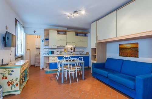 "Corbezzolo", 1-room apartment 40 m2, on the ground floor. Practical furnishings: living/sleeping room with 1 sofabed (140 cm), 1 double sofabed, dining table and TV. Exit to the patio. Open kitchen (2 induction hot plates, toaster, kettle, microwave, electric coffee machine). Bath/bidet/WC. Electric heating, gas heating, air-conditioning. Patio 12 m2, partly roofed. Terrace furniture. Side distant view of the countryside. Facilities: washing machine, hair dryer. Internet (WiFi, free). Maximum 1 pet/ dog allowed. IT050021C27VXLUMQE