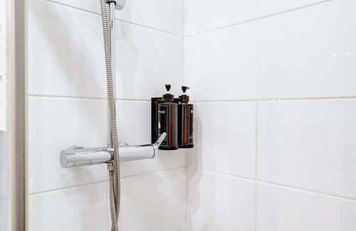 The neat and functional bathroom includes a shower, welcome toiletries (shower gel, shampoo), a hairdryer, and a WC.