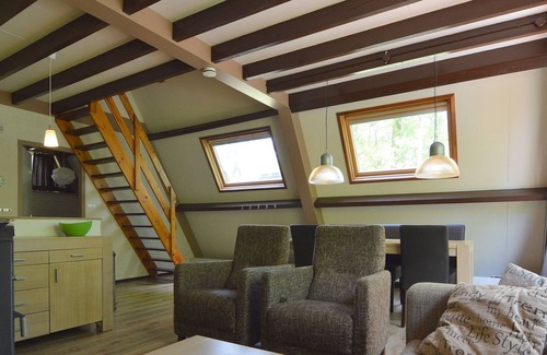 This bungalow is extra attractively furnished with a cosy wood-burning stove, an open kitchen, lovely armchairs and a PlayStation game console. This, combined with its location on the edge of a small holiday park overlooking the forest, makes it a great place to unwind.
