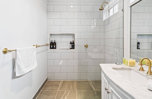 The newly renovated bathroom in this cottage is a true highlight. Featuring a spacious shower, elegantly adorned with gold furnishings and a luxurious marble top vanity. There are fresh towels and essential toiletries provided for your convenience.