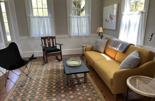Artist owned antique 200 yr old cape style farmhouse on 50+ acres. 3075 feet of tidal Oyster River frontage. Walking paths through hay fields. Cabin by river to explore or picnic by. Dog friendly for well behaved dogs. Home is next door to the main house and barn where the artists owners live.