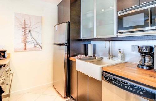 The fully equipped kitchen boasts sleek stainless steel appliances, ample counter space, and everything you need to whip up delicious meals. Enjoy your culinary creations at the cozy dining table or breakfast bar, where you can savor your meal in the comfort of this stylish space.