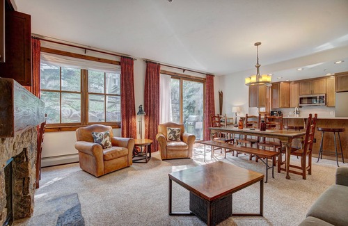 Updated, quiet condo on Main Street! Walk into an inviting living space with brand new kitchen, open layout, large windows and gas fireplace. Walk to anything in Breck or hop on the free trolly. Master bedroom features a king with attached bath while the guest bedroom has a queen plus bunk bed and its own attached bath. Private gas BBQ grill, in-unit laundry and detached 1 car heated garage are other bonuses. Onsite hot tubs plus access to heated pool, hot tubs, fitness center and steam room!